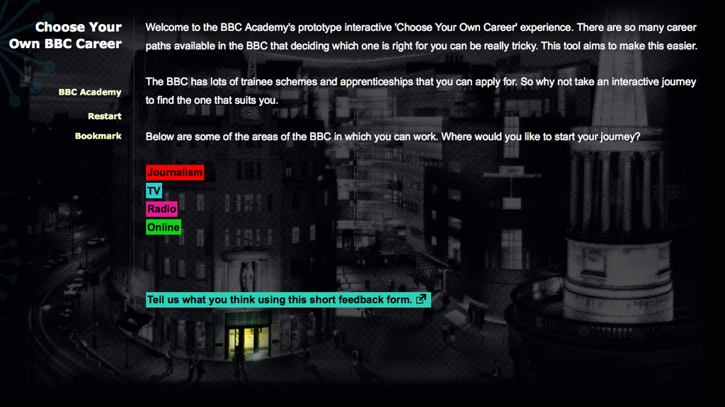 Project Brief: To use free platform www.twinery.org to build an interactive story which uses existing BBC Academy content and acts as a career pathway, guiding potential entrants to the correct BBC trainee or apprenticeship scheme based on the choices they make.