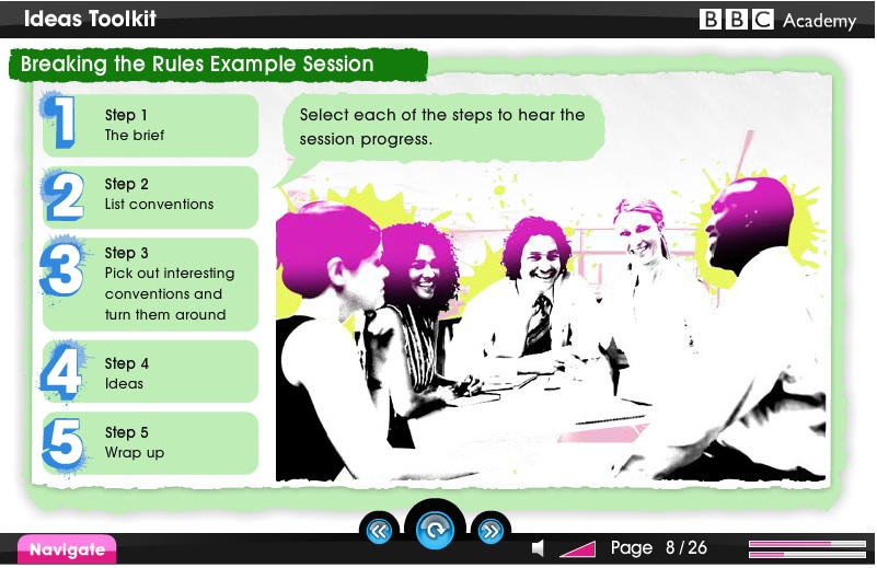 Brief: To create an online resource which provides a practical introduction to three idea generation techniques for BBC production staff. To work with Line Communications (now part of LEO Learning) to create a re-useable Mohive (rapid development e-learning tool) skin.