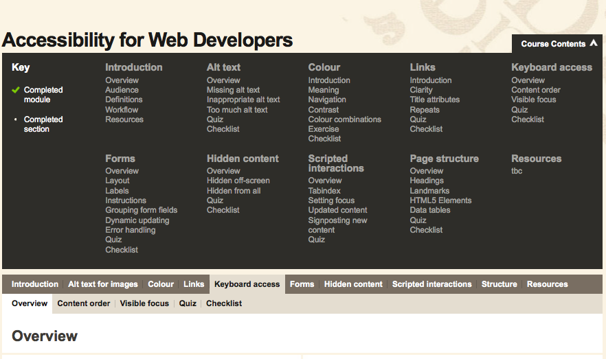 In the left hand corner, is the key. Page names change from grey and white once they have been visited and because you can’t just show a change in state in colour because of accessibility, there is a dot next to each visited section and a green tick once a module has been completed.